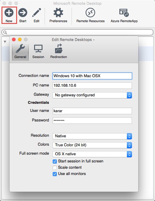 3. When the app downloaded, open that and you’ll see it, just click on New and enter the Connection name, PC name or IP address and also username and password of the windows 10 user also you can setup other settings if you want then close it when finished setting.