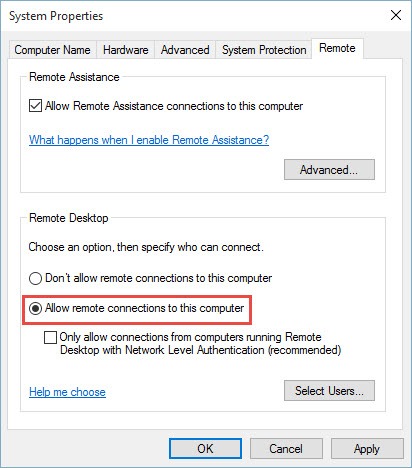 Note: Don’t allow connections only from computers running remote desktop with network level authentication because you may face security problems.